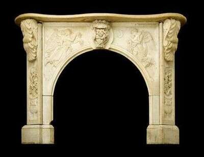 The serpentine top over two relief carved 'Night' and 'Day' allegorical figural spandrels above an arched fire opening flanked and divided by acanthus corbels over canted carved foliate side panels, signed A. Thorvaldsen.