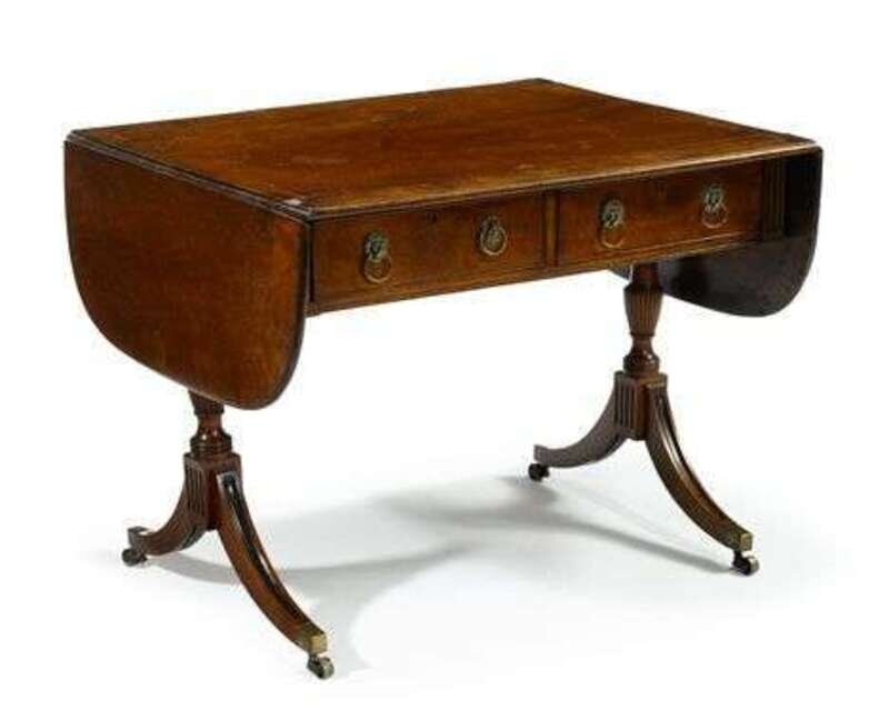 The rectangular top with D-shaped drop down sides over two short frieze drawers opposed by a false drawer, supported by reeded baluster standards on saber legs ending in brass caps and casters.