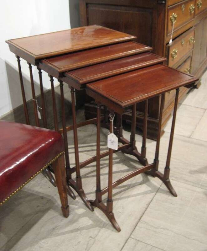 Each with a rectangular cockbeaded top over turned legs on trestle feet.