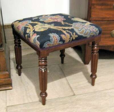 The cushioned seat above a plain seat seatrail, raised by four turned and fluted tapered legs.