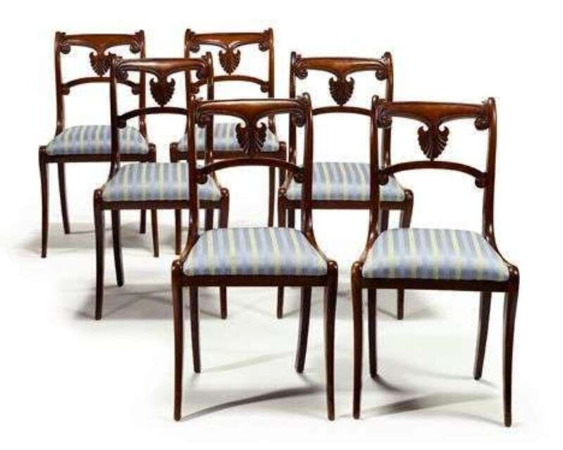 Each with a scroll carved crestrail over a carved palmette splat and backrest, above a drop-in seat, raised on saber legs. (6).