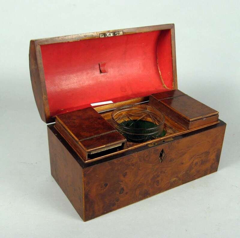 Rectangular with a domed lid, the interior fitted with two removable tea compartments and a later glass mixing bowl.