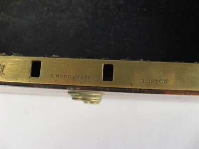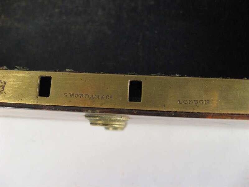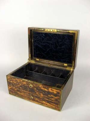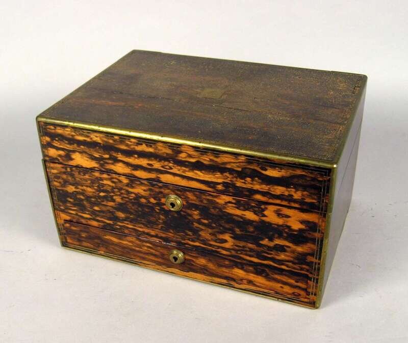 The rectangular box lid with a small brass crest inscribed ' Iota non verrs', opening to a compartmented interior, with single long drawer below.