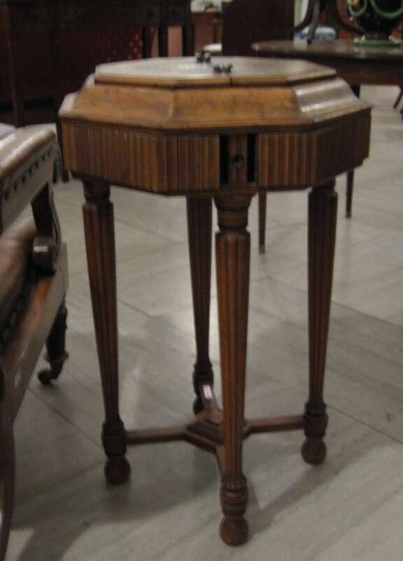 The octagonal top with ebonized foliate inlay, opening to a compartmented interior, above a reeded frieze with four swing-out drawers, above ring turned and reeded tapering legs joined by an X-form stretcher.