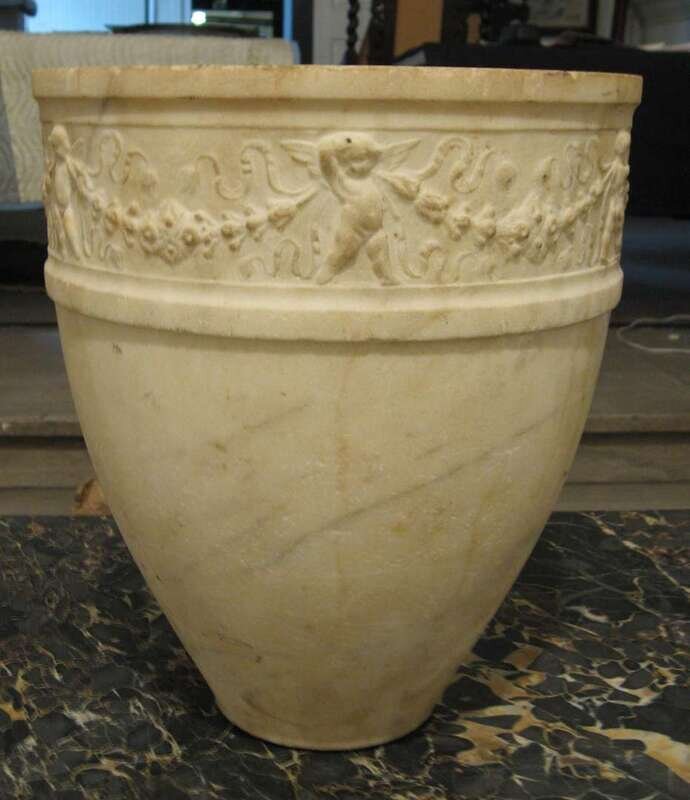 Of tapered cylindrical form with a carved frieze of cherubs holding a ribbon tied garland.