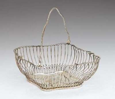 Of pinched lozenge form with a rope-twist rim and swing handle above vertical wire-work sides and plain base; monogrammed.