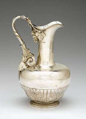 Of bottle form with a grapevine scroll handle, the body with a stippled ground over a part reeded and foliate belly, raised on a leaf cast circular foot.