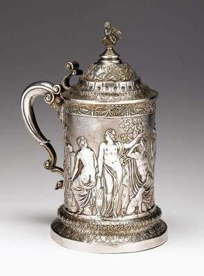 Of tapered cylindrical form; the hinged lid surmounted by a putti finial and a double scroll handle, the body with a continuous repousse scene of classical figures.
