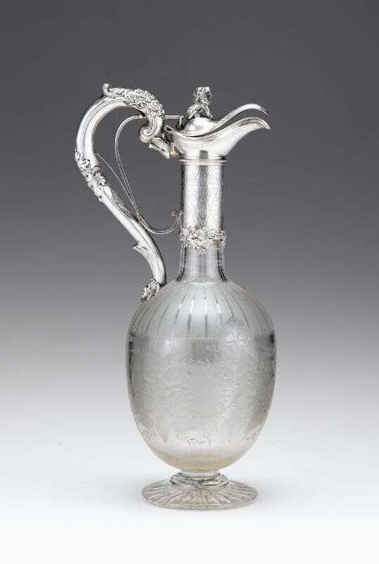 With a leaf and grape vine cast scroll handle and curved spout with seated lion finial above an etched neckband with diaper pattern over a body of clear and frosted glass etched with floral bouquets, raised on a circular foot.