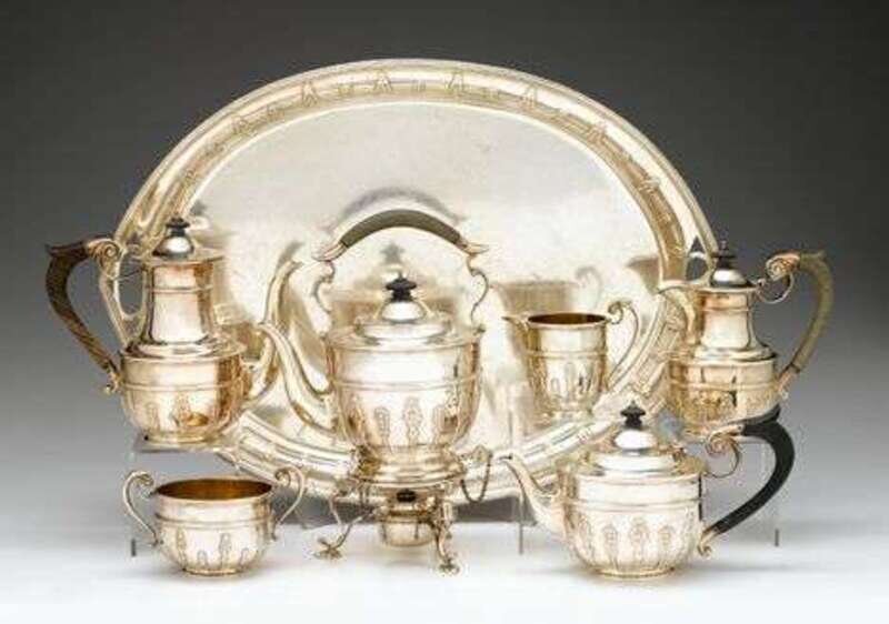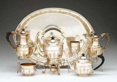 Comprising a kettle-on-stand, coffeepot, teapot, hot milk jug, sugar bowl, cream jug and tray; each with a banded baluster body with raised foliate bands and scrolled treen handles.(7).