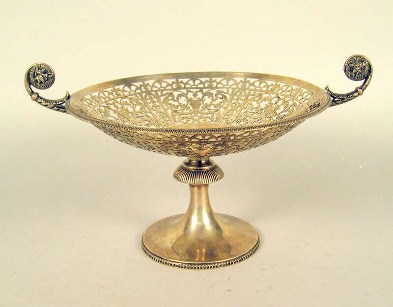 The foliate pierced dished top flanked by scrolling handles with lion's mask ends, raised on a circular foot, retailed by J.E. Caldwell.