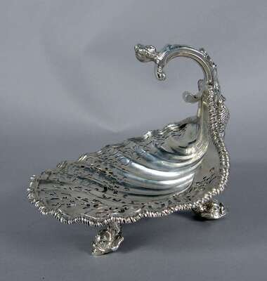 With a pierced shell-form bowl and handle cast with a female term raised on dolphin supports.