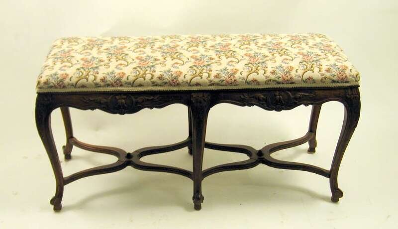 The long rectangular cushioned seat over a foliate carved serpentine seatrail raised on cabriole legs carved at the knee, terminating on pad feet.