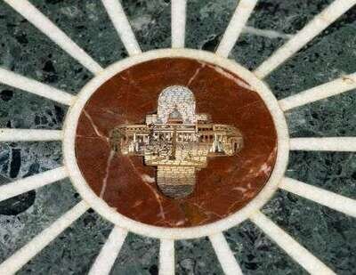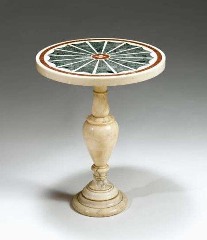The circular top centered by a micromosaic depicting St. Peter's Square and green marble fan inlay enclosed by a rouge marble band, raised on a baluster standard and circular foot.