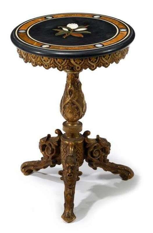 The circular black slate top with inset hardstones depicting a magnolia blossom enclosed by an onyx band above a carved frieze and raised on a c-scroll and foliate carved standard ending in a triform base carved with grotesque masks and scrolled feet.