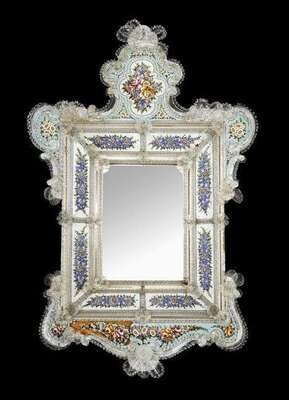 The rectangular mirror plate enclosed by micromosaic floral panels and marked at the top, bottom and corners by further cresting and corner panels.