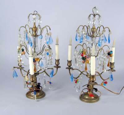 Pair of gilt metal colored and clear glass three stem candelabra