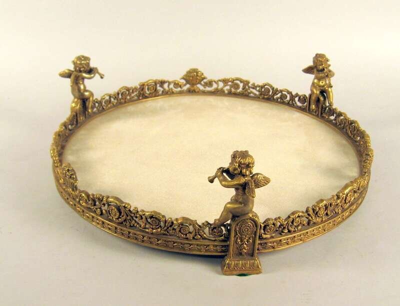 The circular gilt bronze pierced scrolling foliate gallery frame with three musical putti mounts around a white crackle glaze porcelain insert.