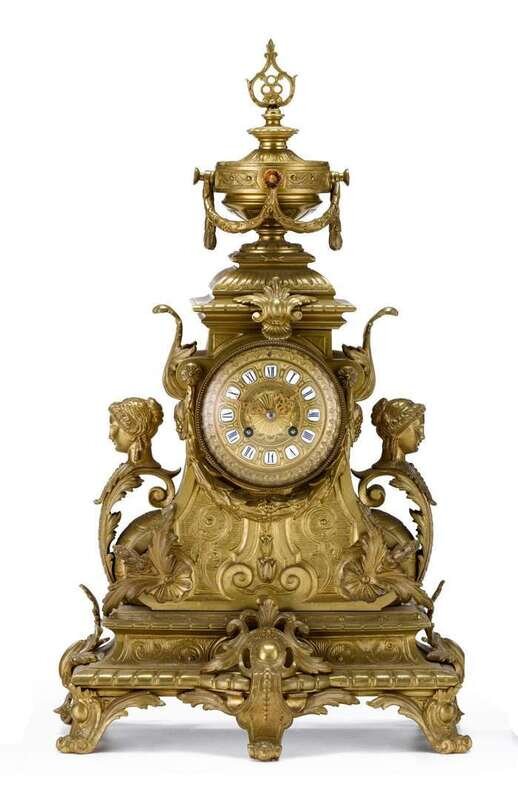 The central circular Roman numeral enameled dial surmounted by a garland strung covered urn, flanked by two female busts, raised on five scroll bracket feet.