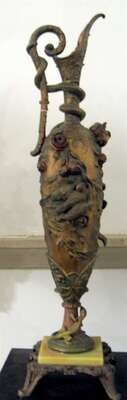 Of slim baluster form with a serpent entwined scroll handle leading to a body with cast figures of birds and putti in foliage raised on a square onyx base and ending in scrolled feet.