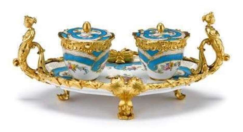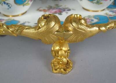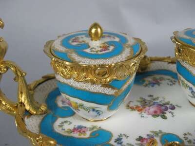 The oval porcelain tray and inkpots painted in 'blue celeste' ribbons and floral bouquets mounted with gilt bronze foliate mounts and figural handles, raised on scroll feet.