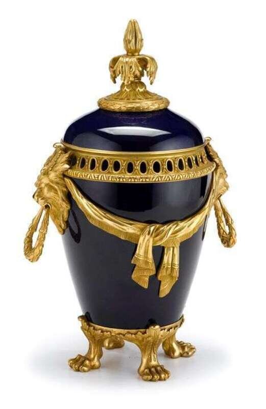 The domed dark blue cover cover with foliate finial above a pierced collar, over a tapered body with lion mask loop handles joined by drapery swags, raised on paw feet.