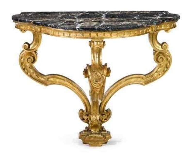 The shaped black marble top above a carved frieze and raised on three foliate carved c-scroll supports.