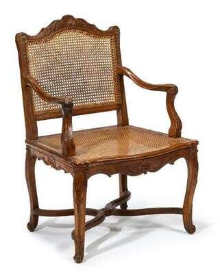 With a shaped caned back with shell and scroll carved crestrail leading to carved open arms above a caned sea, raised on cabriole legs joined by an x-form stretcher ending in scrolled feet.