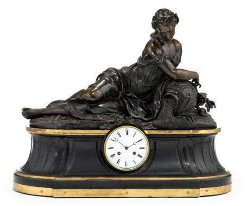 The reclining figure of Sappho surmounting an oval fluted and waisted black marble and bronze base inset with the circular white enamel Roman numeral dial.