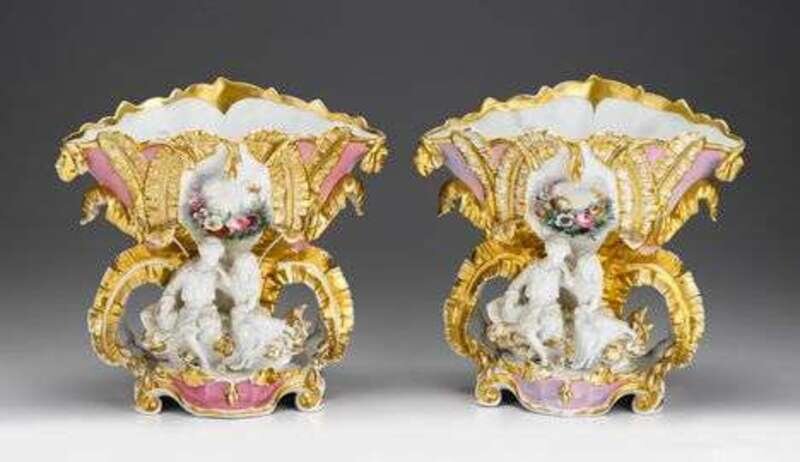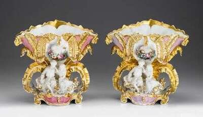 Each pink glazed and gilt decorated, foliate molded vase centered by biscuit figures of children beneath reserves painted with floral sprays, incised marks to base.