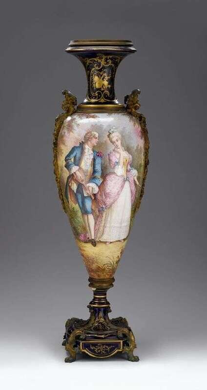 Of slim baluster form decorated with a garden scene of a young couple in 18th century dress, with scrolled bronze mounts to the sides; raised on a square foot ending in scrolled bronze feet.