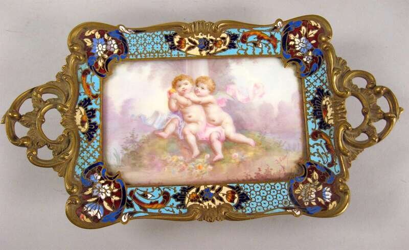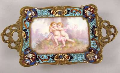 Comprising a two-handled tray with inset porcelain plaque of cherubs and a marble inset chamber stick; both unmarked. (2).