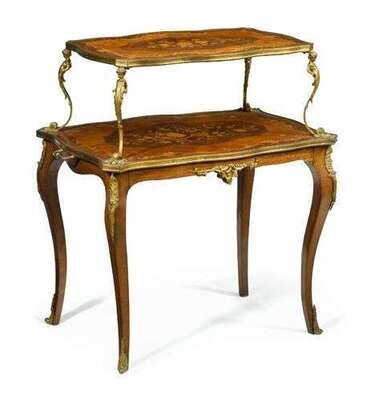 With two shaped tiers inlaid with foliage and supported by gilt bronze stiles modeled as putti raised on cabriole legs ending in sabot.