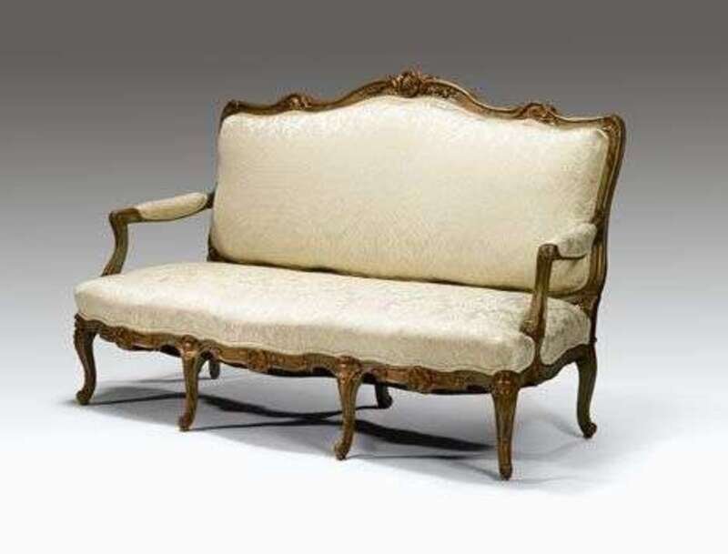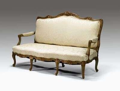 Comprising a settee and pair of fauteuils a la reine, each with a shell and foliate carved crestrail continuing to padded arms and scrolling handholds on voluted supports, the seatrail carved with C-scrolls, raised on cabriole legs ending with scrolled toes. (3).