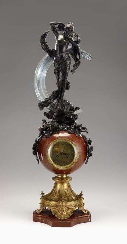 The rouge marble globular case surmounted by a bronze figure of a semi-clad classical woman attended by putti, and mounted with a glass crescent shaped moon, raised on a spreading gilt bronze support with mask feet, on an incurved square rouge marble base.