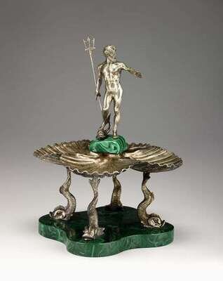 The figure of neptune holding a triton, surmounted on four shell-form dishes raised on fish supports and a shaped malachite base, the silver stamped '800'.