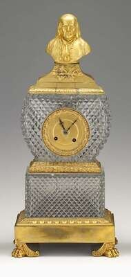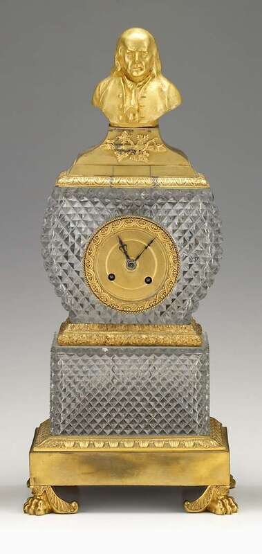 Of waisted rectangular form, surmounted with a bust of Benjamin Franklin and raised on a rectangular stepped base ending in winged paw feet; the works stamped 'MJ 41'.