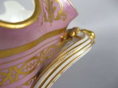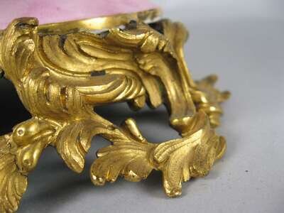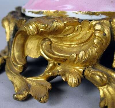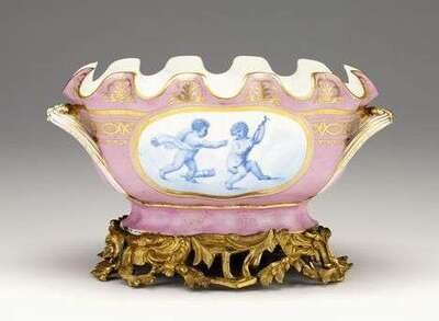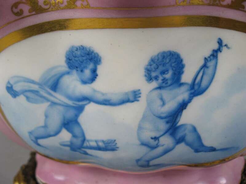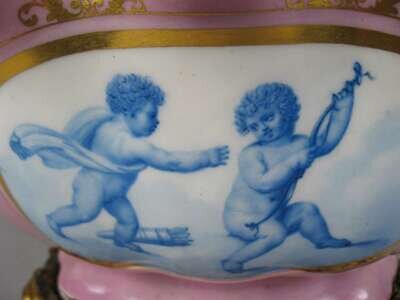 The wavy shaped rim over a blue painted reserve depicting cupids, within pink and gilt painted ground with molded twin handles on a pierced rococo style gilt bronze stand, blue Sevres mark to base.