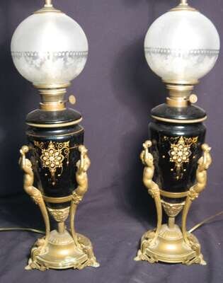 Each with a frosted and etched glass globe over a tapered porcelain body with enamel decoration on a cobalt blue ground, mounted with patinated bronze figures of putt and raised on a circular foot. (2).