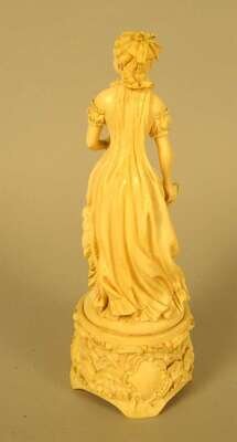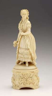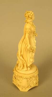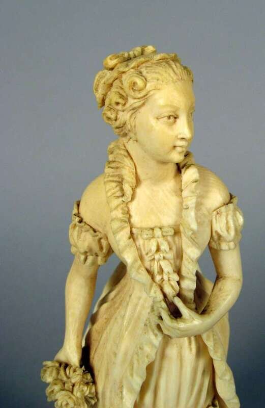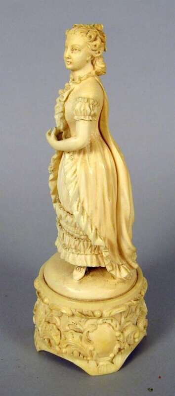 Dressed in 18th century dress, holding a bouquet of flowers, raised on a foliate scroll rococo base.