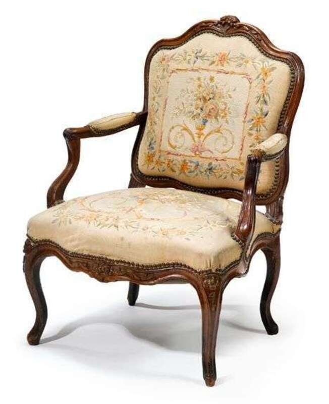 With a shaped padded backrest with c-scroll and foliate carved toprail leading to padded armrests and carved handholds above a padded seat raised on foliate carved cabriole legs.