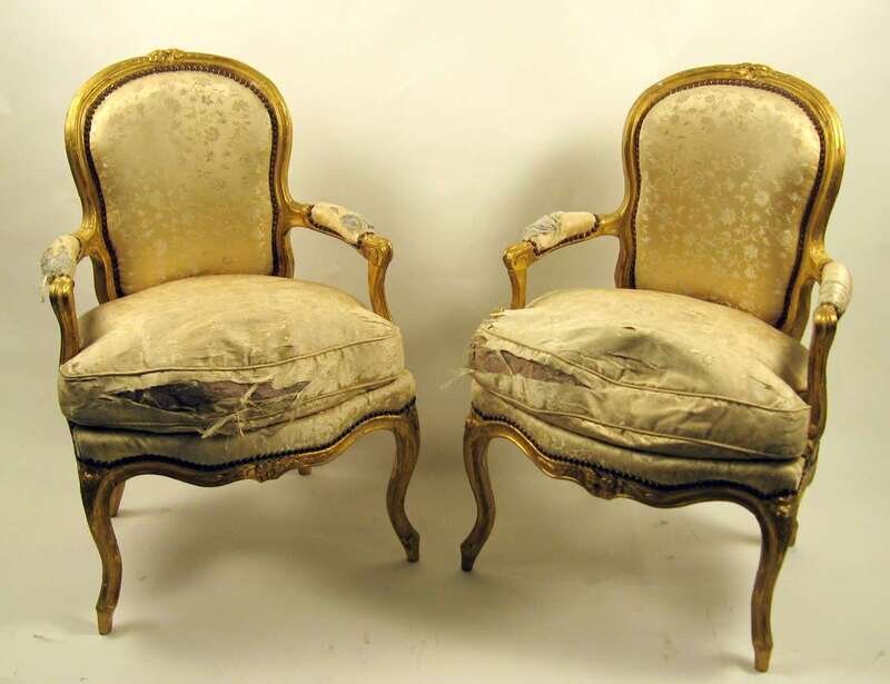 Each with a shaped padded backrest with foliate carved toprail leading to open padded armrests above a loose cushion seat raised on cabriole legs.