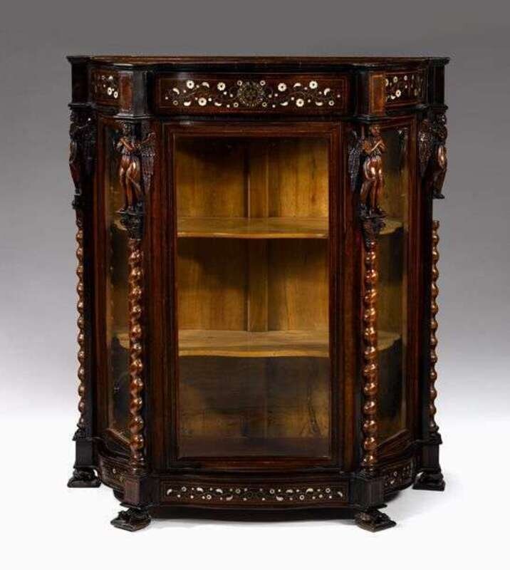 Northern European mother-of-pearl inlaid carved walnut vitrine 19th century