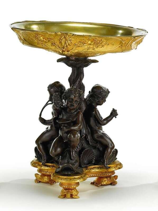 The shallow dished gilt bronze top cast with hunting scenes and animal trophies, the interior roundel depicting Bacchus and Silenius with attendants, raised on a patinated bronze standard of dolphins with entwined tails mounted by putti, on a gilt bronze triform base supported by turtles.