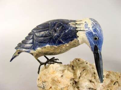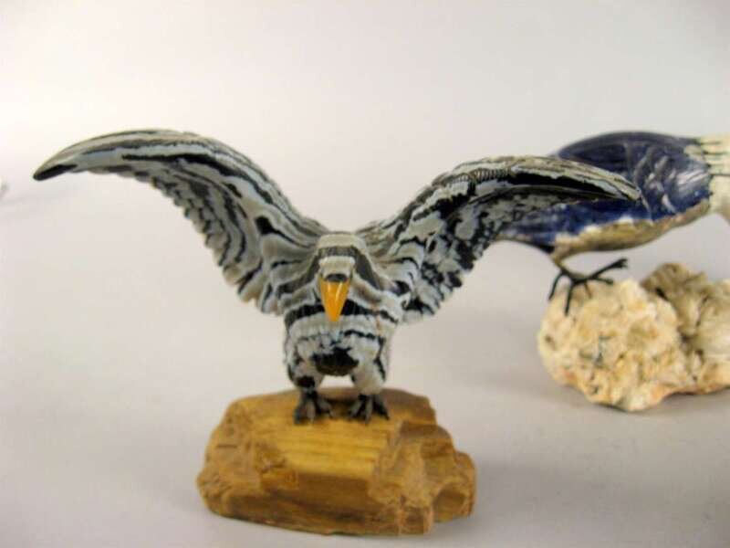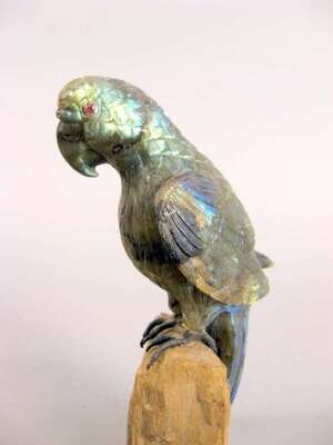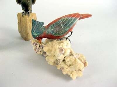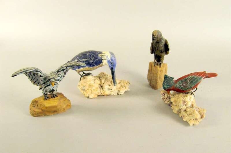 Comprising a kingfisher, woodpecker, eagle and a parrot; each carved from variegated hardstones and resting on mineral bases. (4).