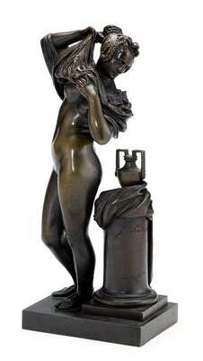 Bronze, medium brown patina, modeled as a woman in the midst of disrobing beside a pedestal and urn, inscribed 'J Pradier / Suisse Fres'.