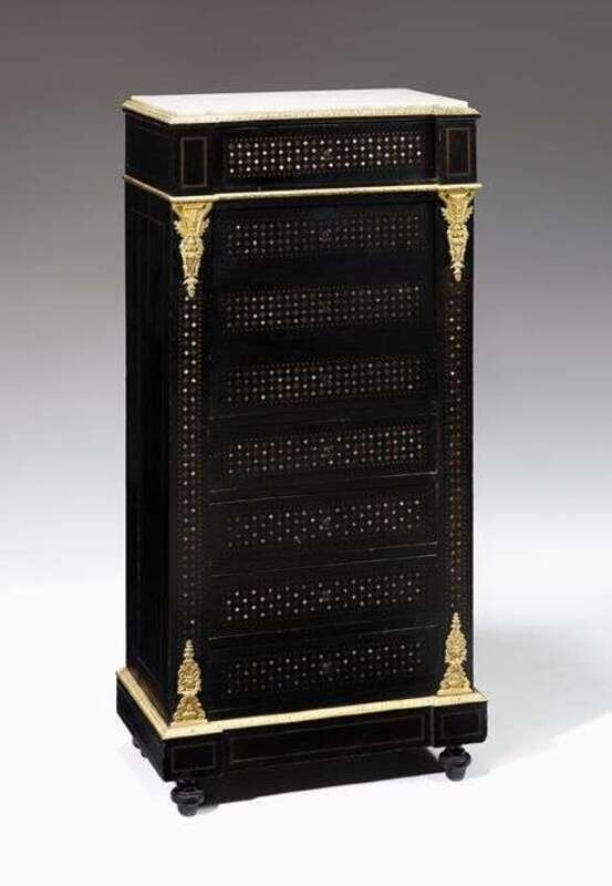 French ormulu-mounted mother-of-pearl and brass inlaid ebonized secretaire a abattant 19th century