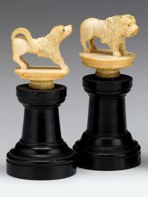 Comprising a lion and a dog, each mounted on an ebonized pedestal base. (2).