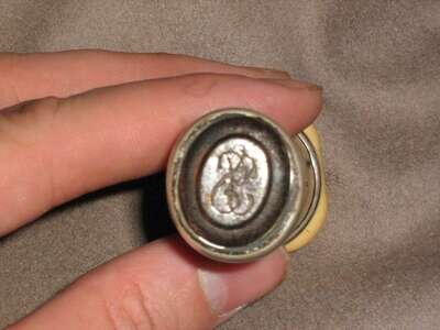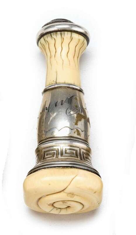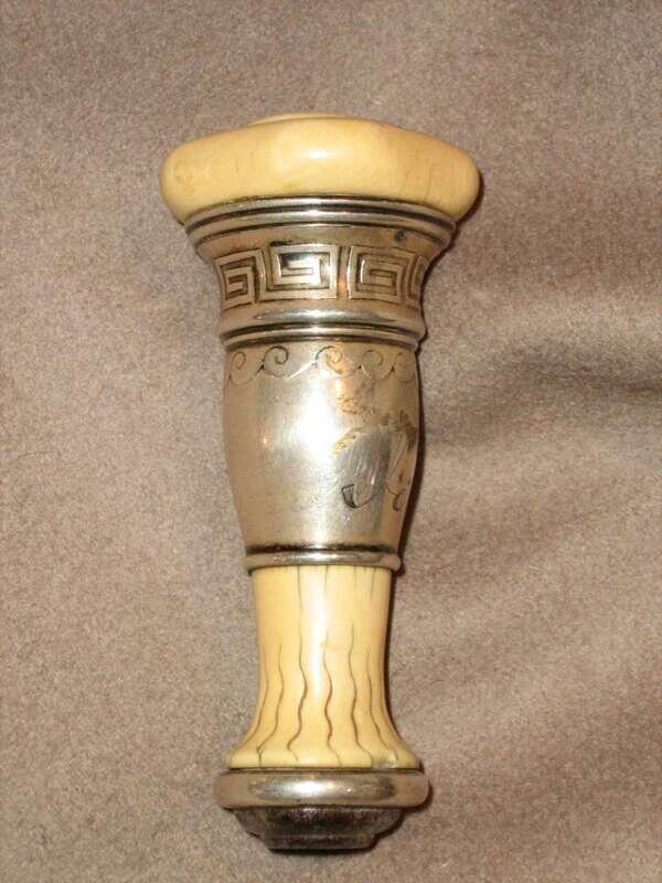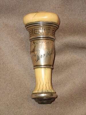 With a squared ivory top with swirl design above a greek-key silver band and inscribed name.