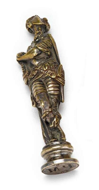 Modeled as a robed soldier in 17th century dress, his sword at his side; seal with initials 'PM'.